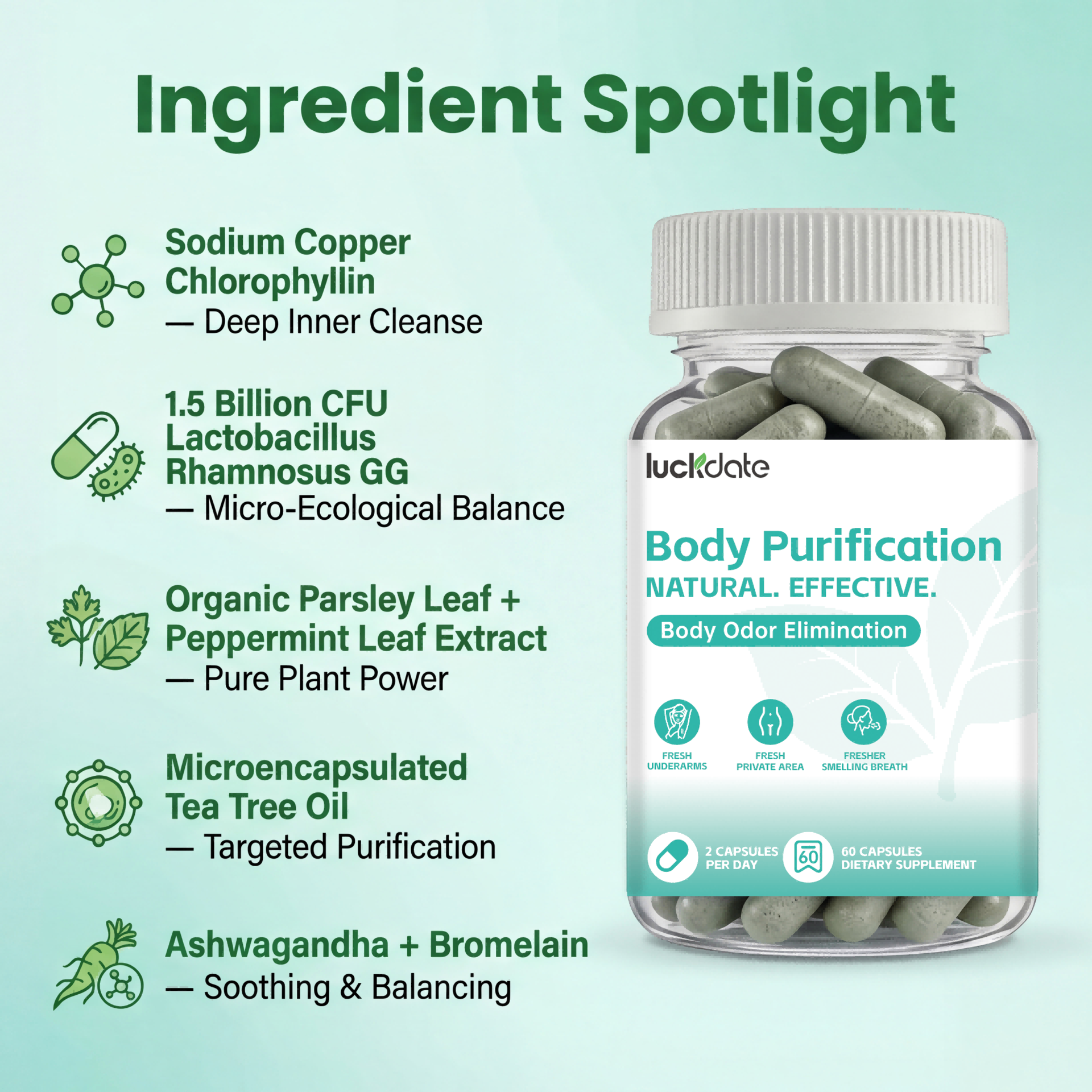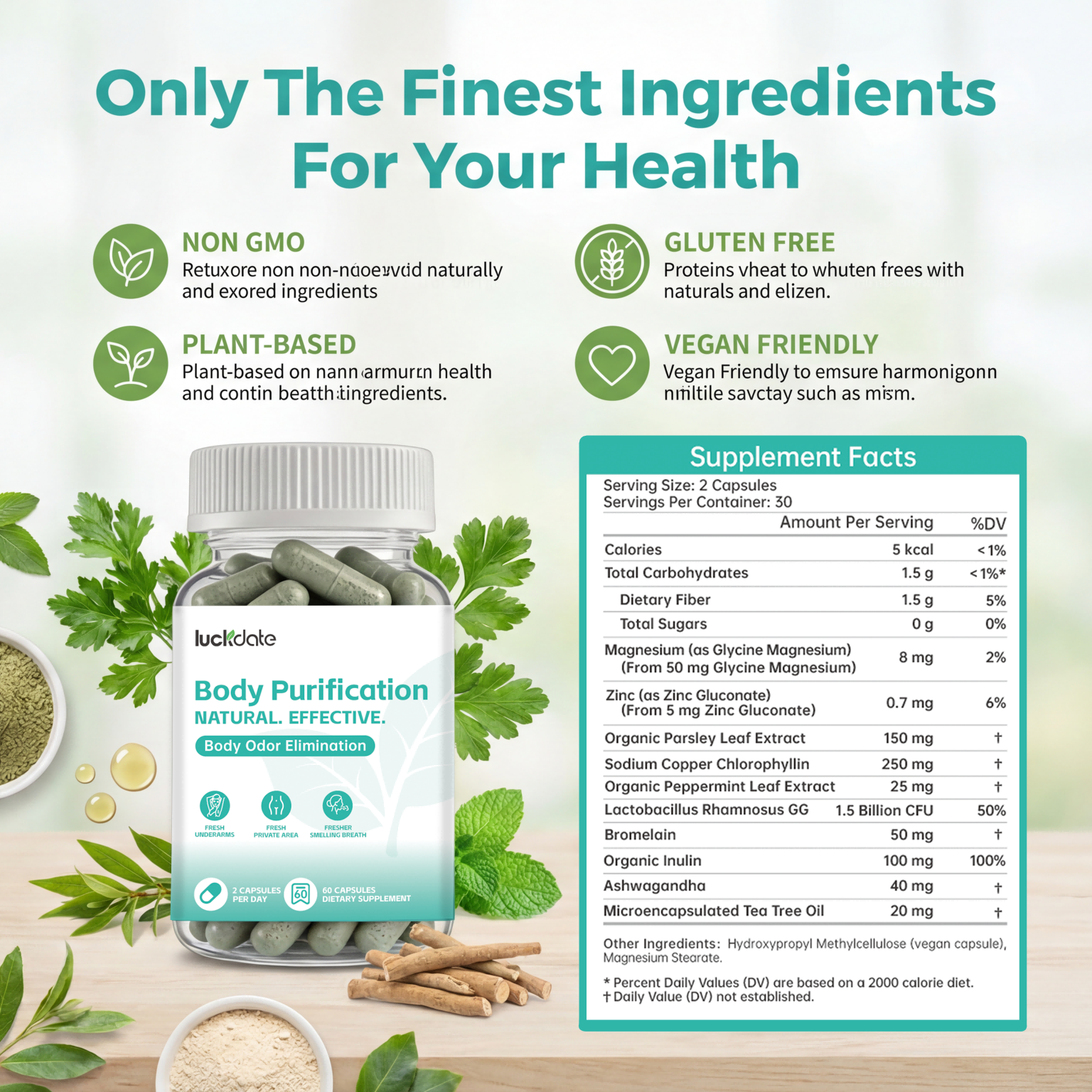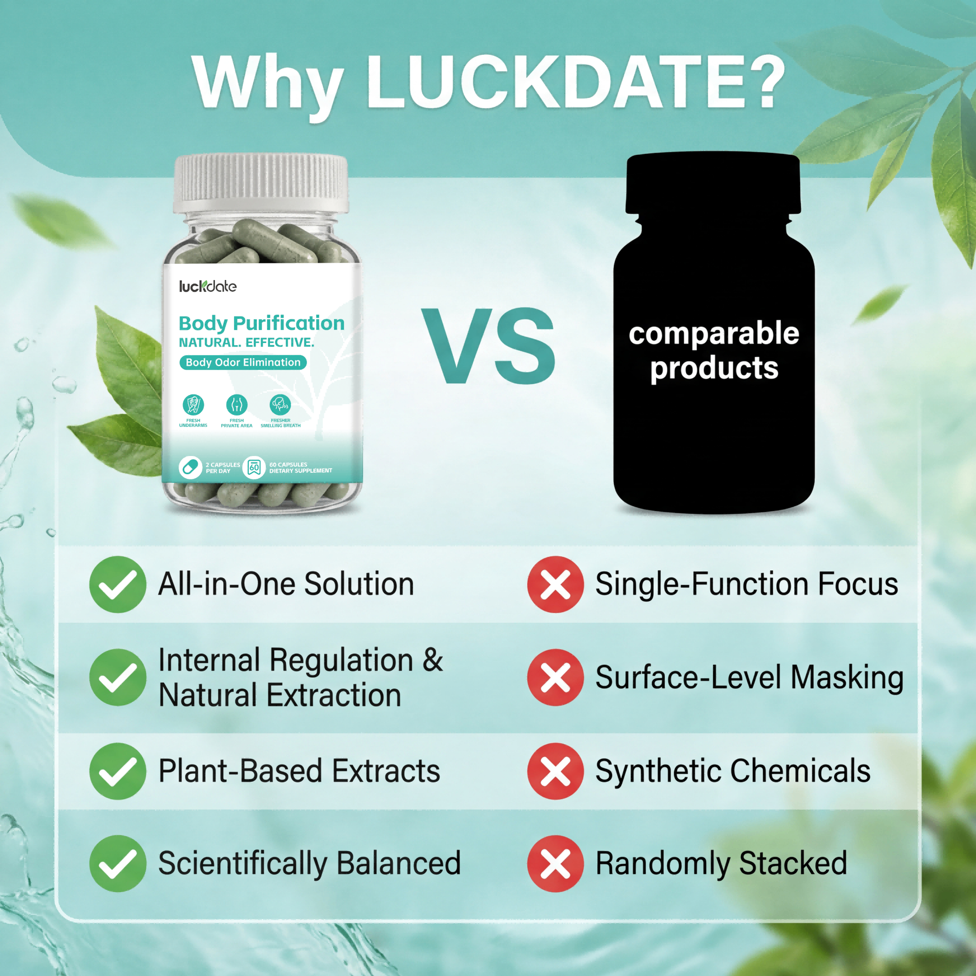 LuckDate's revolutionary internal deodorant works from the inside out, neutralizing odor-causing bacteria at the source. One simple capsule a day gives you 24/7 fresh-breath confidence.